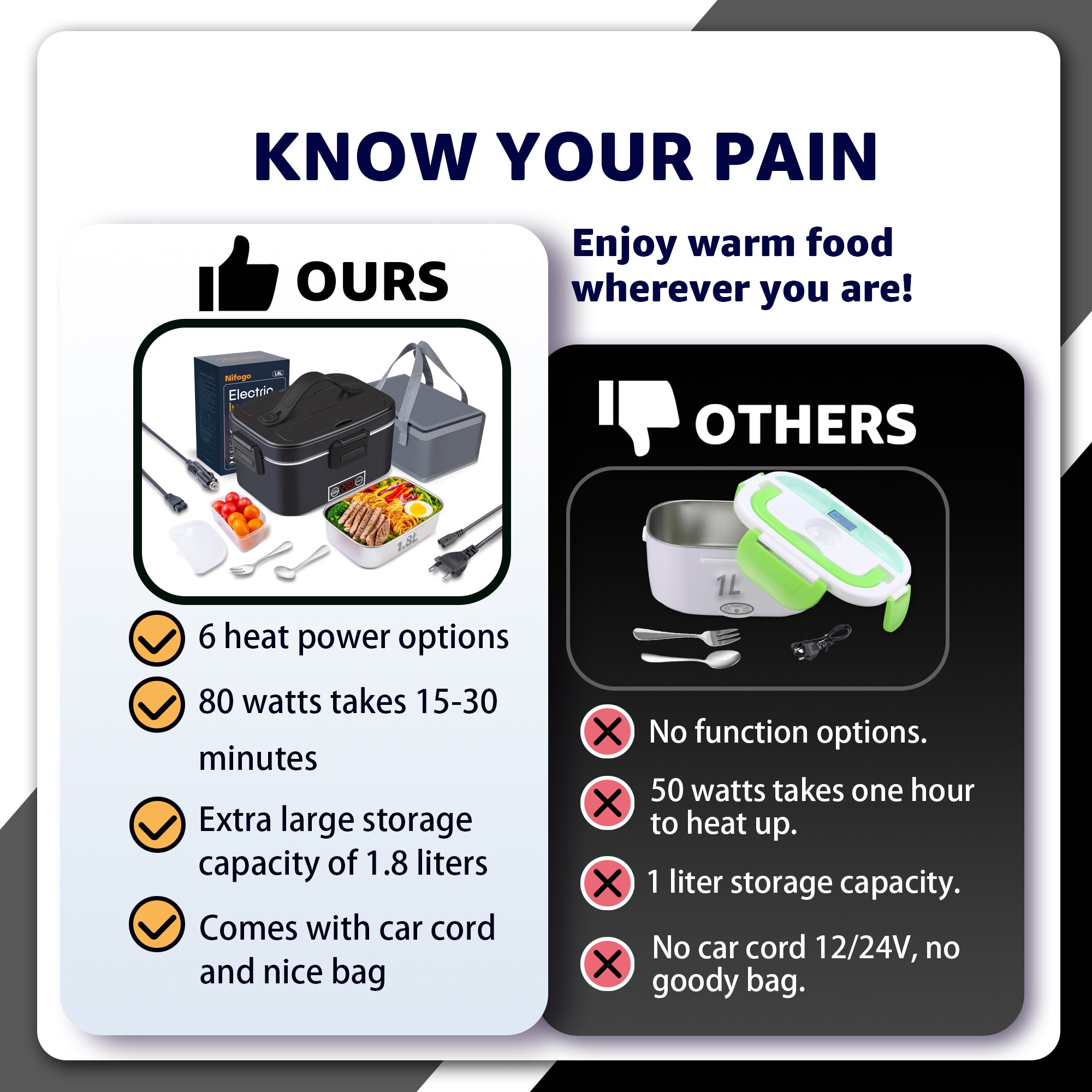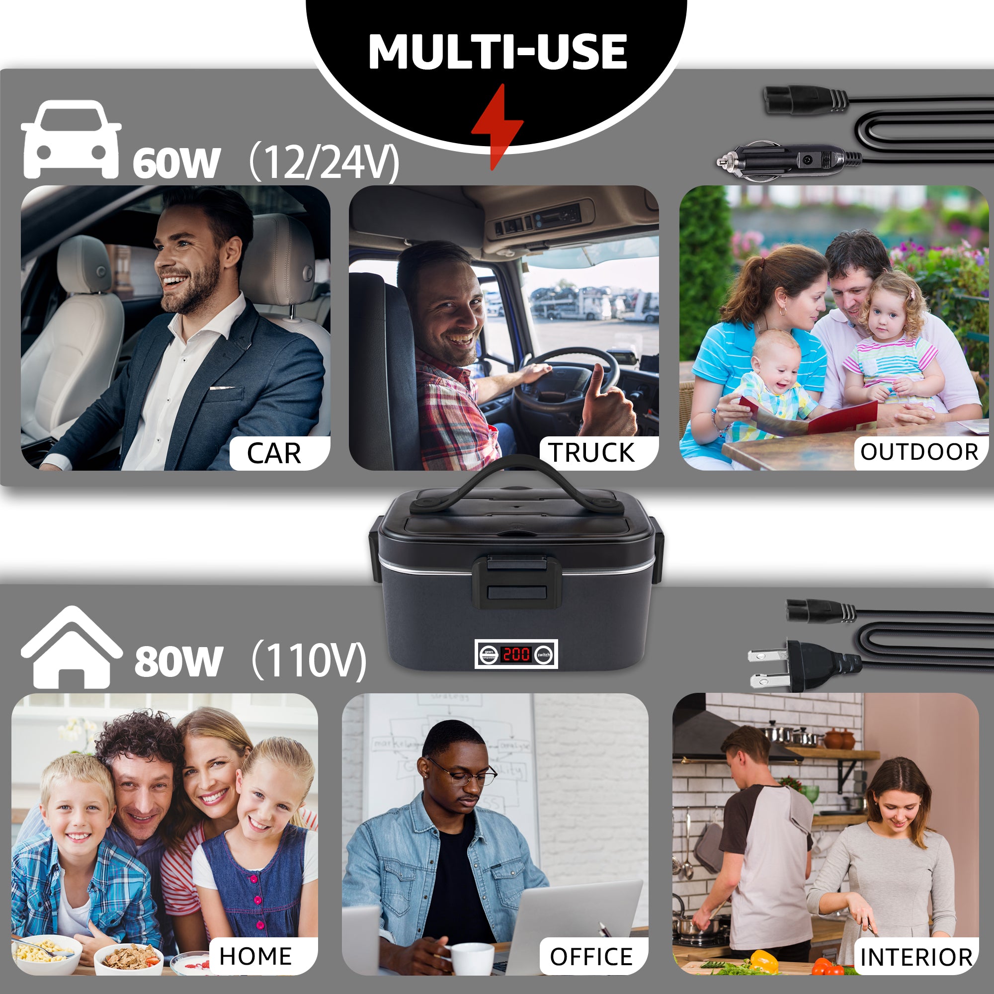 - 【Voltage 3 in 1】The food warmer lunch box supports multiple voltage inputs (12V/24V/110V), so that users can enjoy a hot lunch anytime, anywhere, whether it's in the car, truck or office, which greatly enhances the product's practicality and convenience. It is also equipped with a 5-country instruction manual for easy operation.