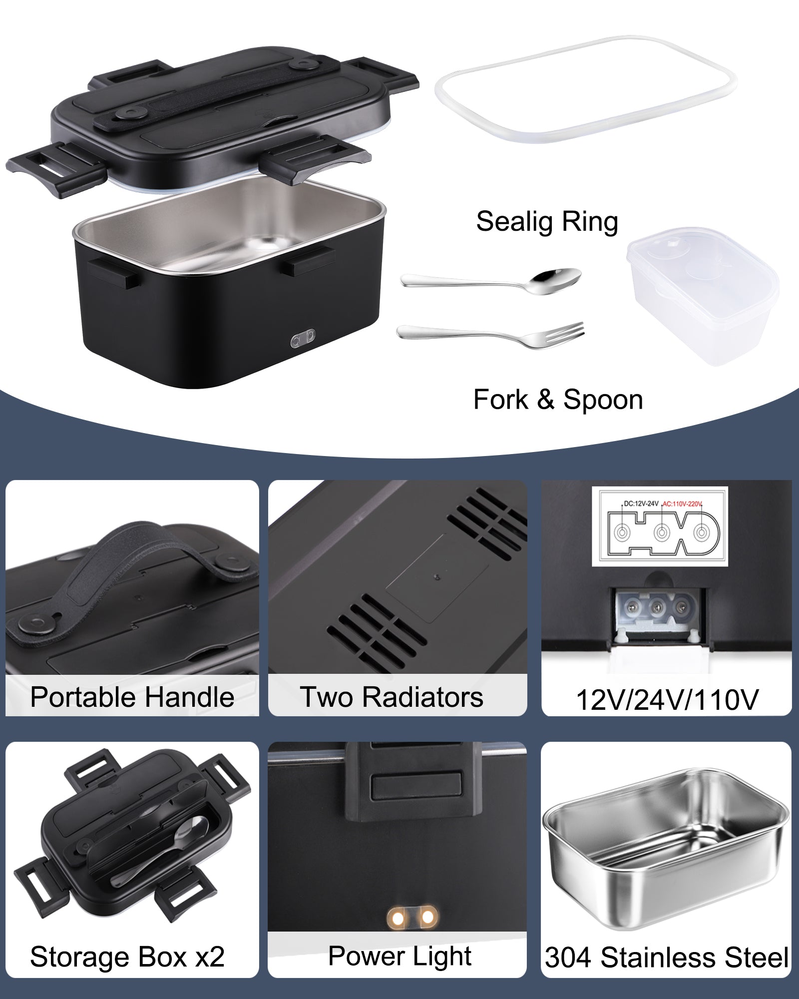 𝗩𝗼𝘆𝗮𝗴𝗲𝗿 Electric Lunch Box for Adults 1800ml/80W Portable Heated Lunch Box for Men 3 in 1 110V/12V/24V-Black