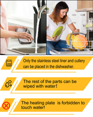 - 【𝗟𝗮𝗿𝗴𝗲 𝗖𝗮𝗽𝗮𝗰𝗶𝘁𝘆 𝗧𝗿𝗮𝘆 𝟭,𝟴𝗟】 1.8 litre large capacity container is made of high quality 304 stainless steel, can fully meet your needs. We also offer 0.4 litre plastic compartments for fruit . Warm reminder: only the stainless steel liner and cutlery can be washed in the dishwasher, for the rest of the accessories please wipe with a dry cloth or rinse with water.Please do not wash the whole electric lunch box for adults into water.