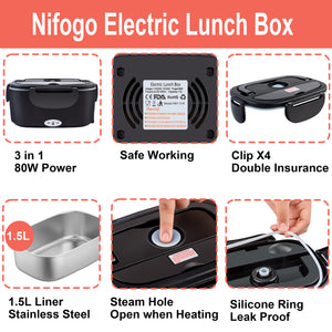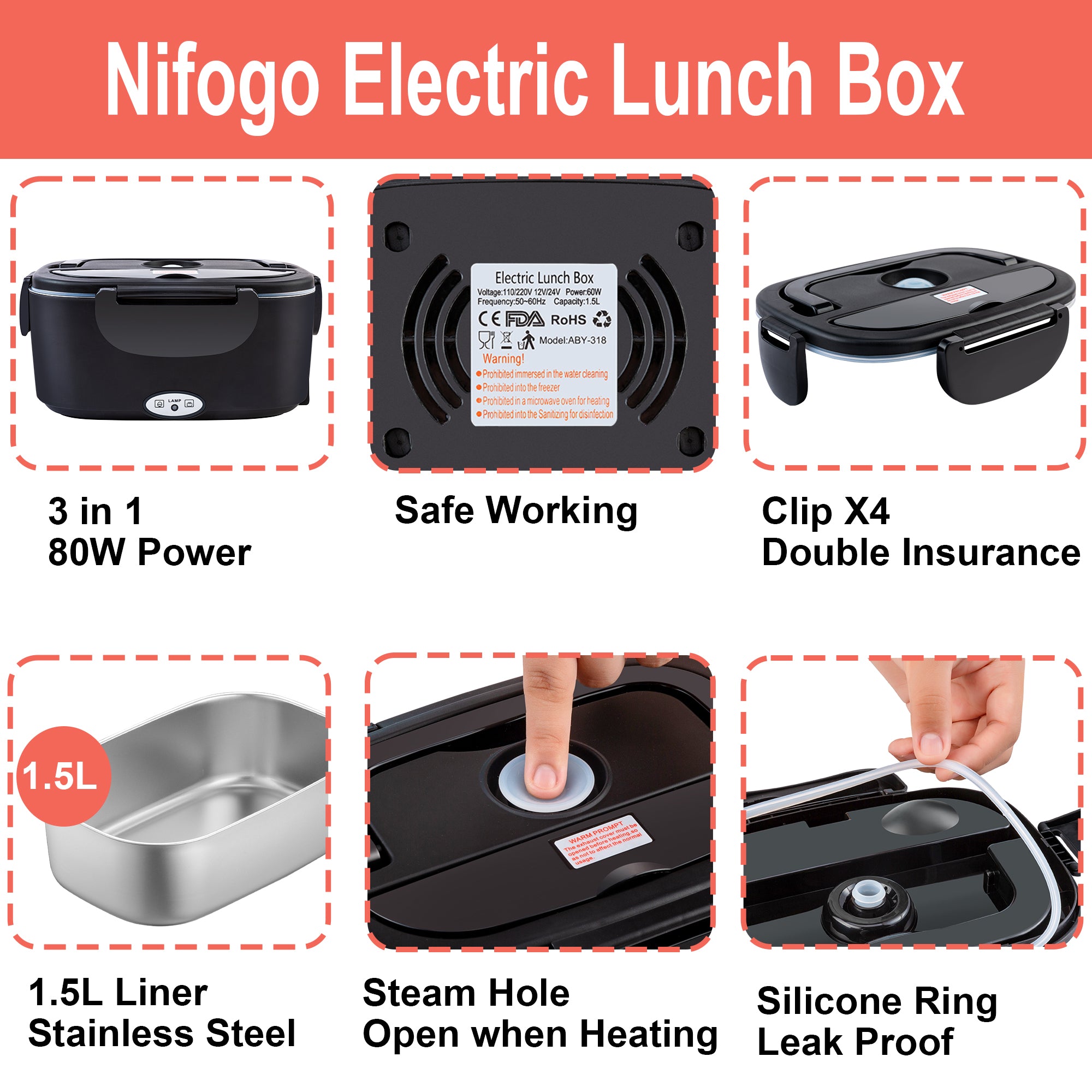 • ใ€๐—ค๐˜‚๐—ฎ๐—น๐—ถ๐˜๐˜† ๐— ๐—ฎ๐˜๐—ฒ๐—ฟ๐—ถ๐—ฎ๐—นใ€‘Electric heating lunch boxes lunch is made of food grade PP material and 304 stainless steel, which is not only durable but also safe. It also comes with an insulated bag, so you don't have to worry about heavy rain and dust and carry the heating lunch box for men easily. If you have any questions about the electric lunch box, please contact Nifogo customer service directly, we will give you a satisfactory answer. This nifogo electric lunch box food heater is not suitable for people 12 years old and under.